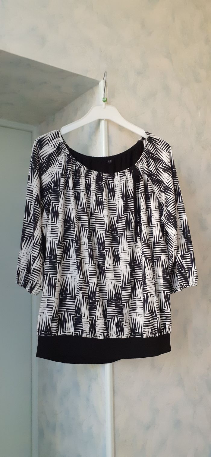 Vends un top manches 3/4, large encolure arrondie, en viscose et élasthanne, élastiques à la base des manches et bandeau à la base pour resserrer, petit lien à nouer sur un côté de l'encolure, couleur blanc et noir devant et noir uni dans le dos, taille 2 sur l'étiquette, 38-40 d'après les mesures. Longueur de l'épaule à la base : 59 cm Largeur aisselle à aisselle : 58 cm.