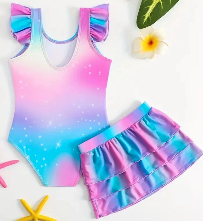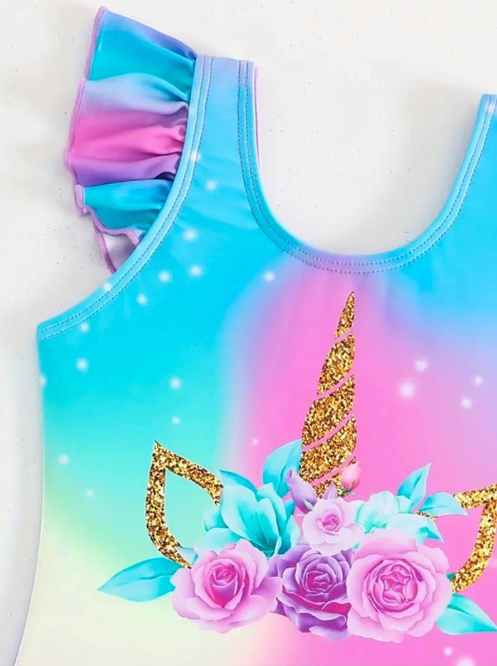 Maillot de bain 1 pièce pour fille avec jupette assorti au maillot de bain de couleur arc en ciel avec tête de licorne sur le devant Article neuf