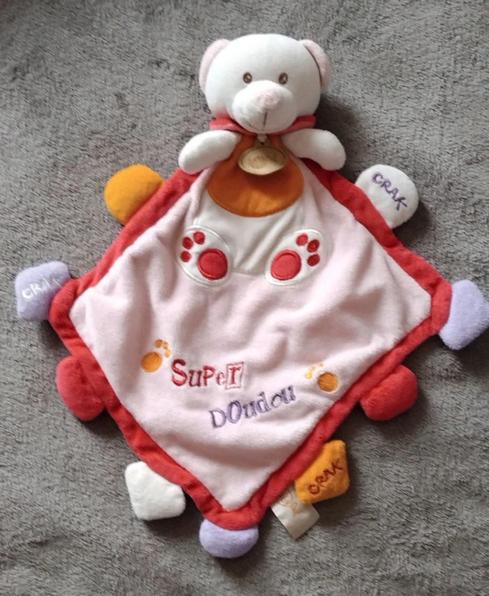 Écritures brodées sur le milieu du doudou " super doudou " et pâtes d ours