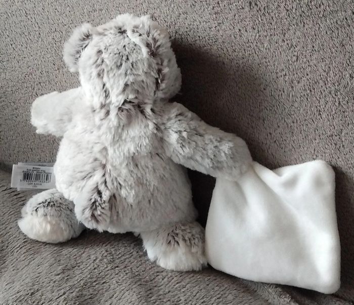 Doudou peluche chat en velours poils de couleurs blanc et gris Un mouchoir en velours de couleur blanc à la main
