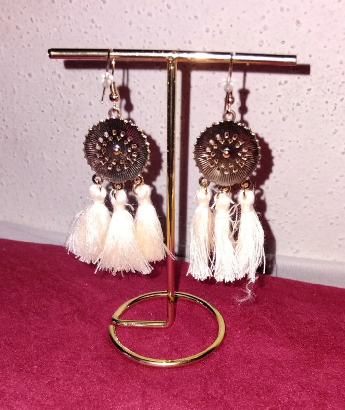 Paire de boucles d'oreilles pendante attrape rêve nacré et doré - photo numéro 1