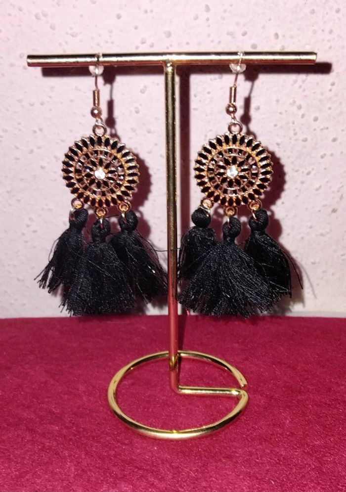 Paire de boucles d'oreilles a clou doré et noir - attrape rêve - photo numéro 1