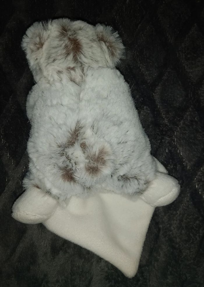 Doudou peluche ours Pm en velours chiné et en velours de couleur blanc Tien entre ces mains un mouchoir en velours de couleur blanc Yeux billes de couleur noir