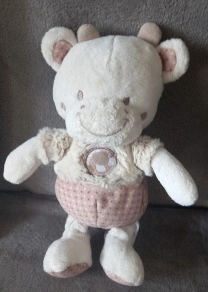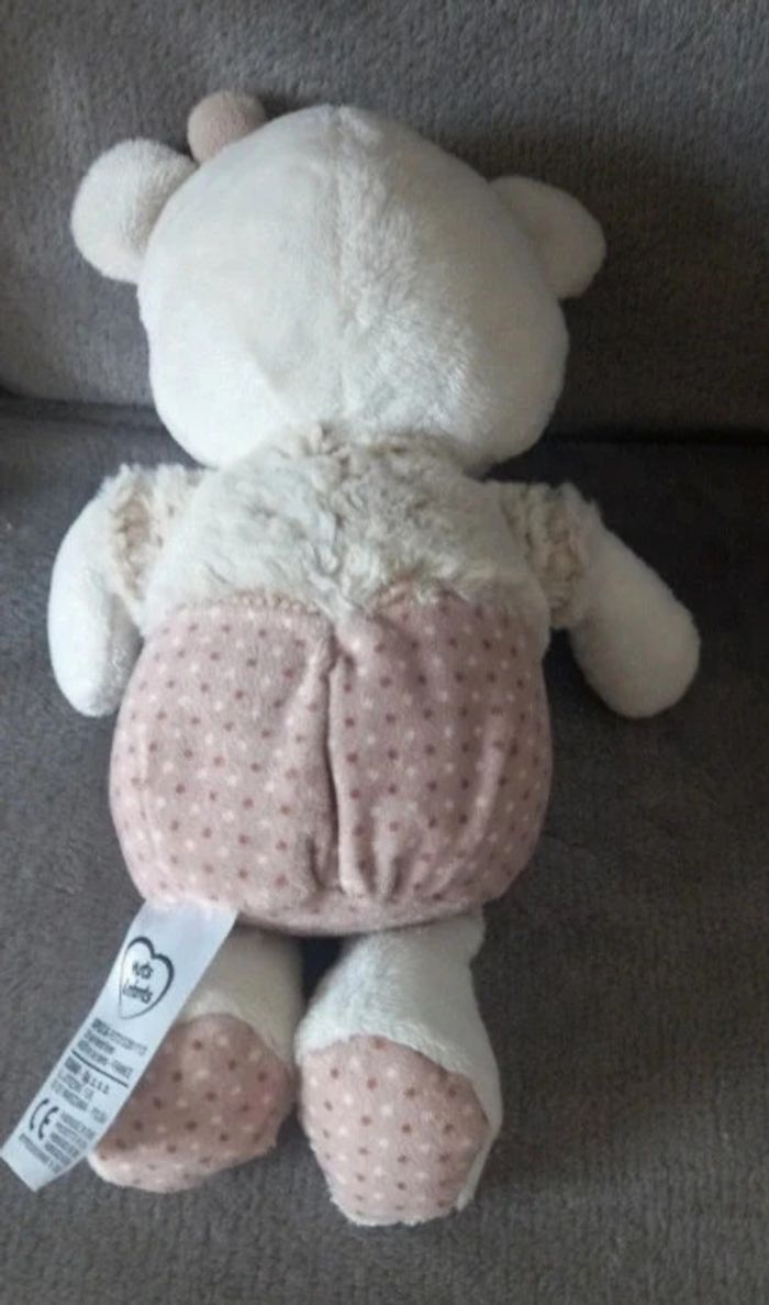 Doudou peluche vache en velours de couleur blanc et beige à pois Écusson brodé sur le haut du doudou Marque : Mots d'enfants En parfait état