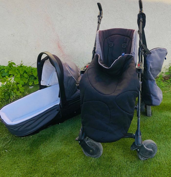Poussette avec cosy nacelle assise couverture poussette sac à langer et un porte bébé assorti offert en plus