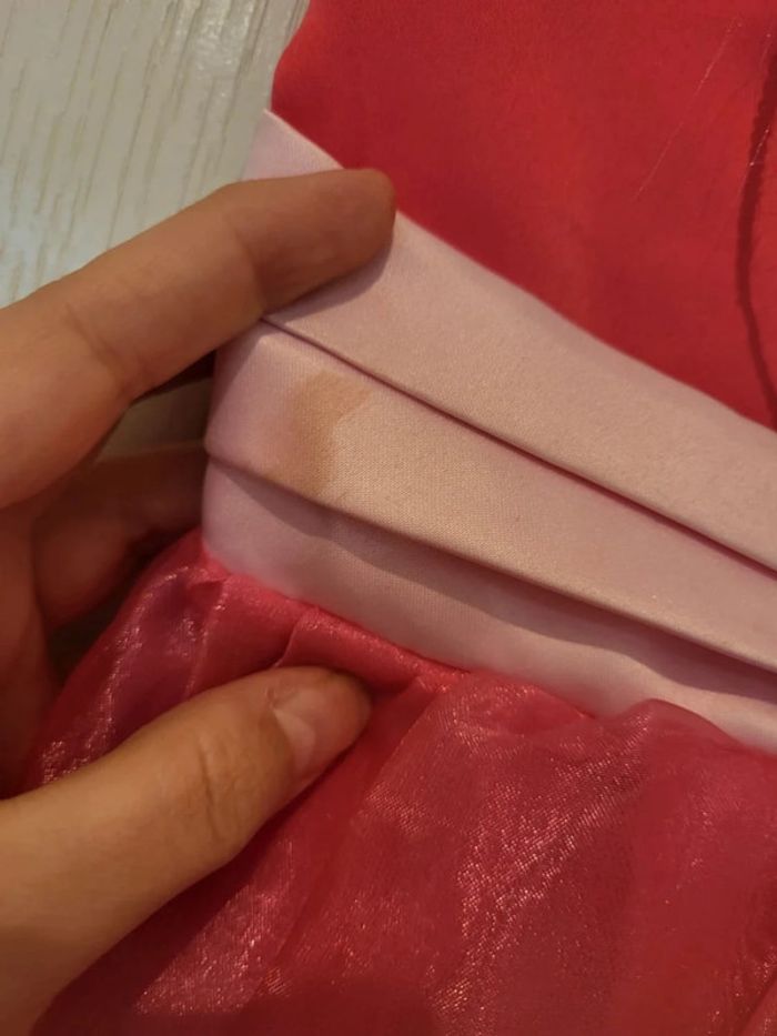 #moudry77fille8ans une tâche. quelques bouloches et la tulle du plastron qui s est décousue d un côté cf photos le noeud est un peu griffé cf photos 130 cm donc 8 ans