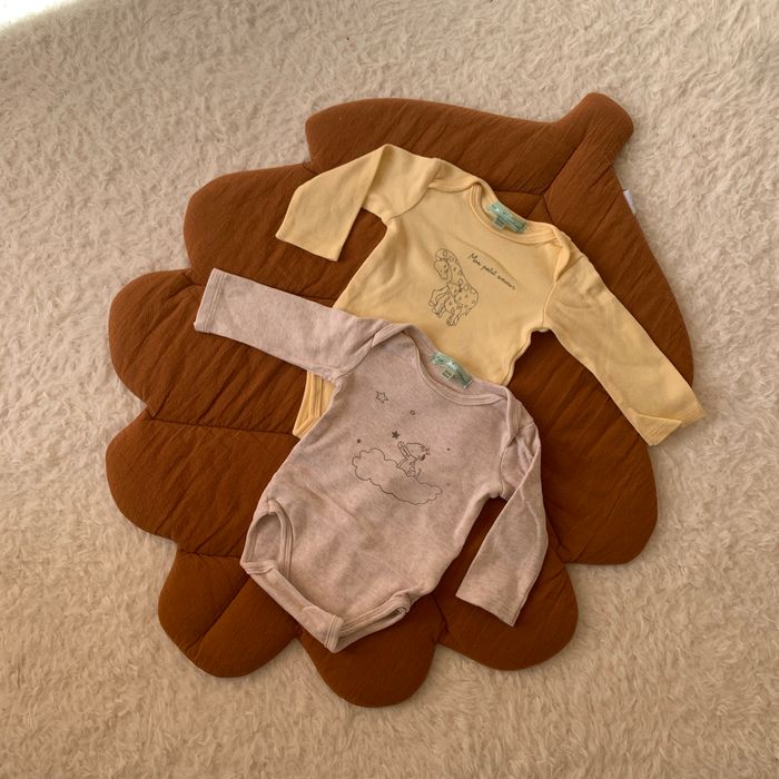 Hello ! Lot de deux bodies couleurs manches longues dans aucune attaches, 3 pressions en bas, taille 62cm marqué les petits cailloux 1 body famille girafe jaune 1 body petites étoiles girafe dans nuage beige