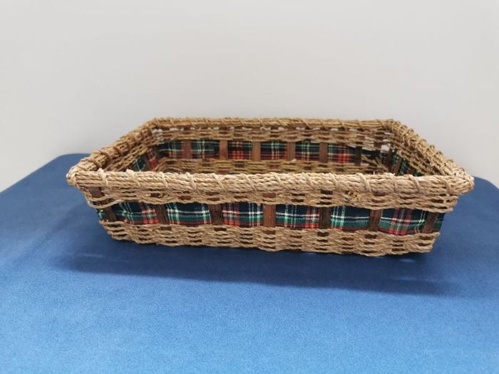 Panier rectangulaire paille tressée et bois, ruban écossais