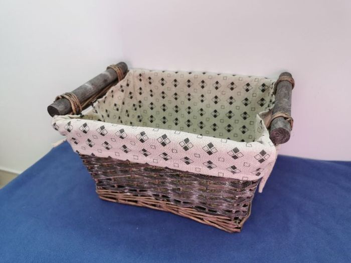 Panier osier - bois gris blanchi vintage + tissu imprimé