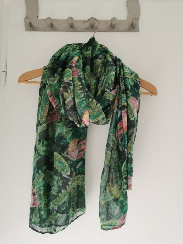 Grande étole verte, motifs de feuillages, quelques oiseaux dans des tons de rose et silhouettes d'oiseaux blancs Etiquette coupée, pour la composition à priori polyester ou viscose Dim : environ 188 x 97 cm Dimensions généreuses avec un tissu plutôt fin, ce qui permet de la porter de multiples façons : en écharpe, pour couvrir les épaules et le dos, entortillée autour du cou, Portée, reste en très bon état global, quelques "rayures" dans le tissage visibles si le tissu est bien à plat, quasiment invisible quand portée. (cf. photos) Je suis addict de ce genre d'accessoires. Je m'oblige à un tri pour diminuer ce "trop d'écharpes". #echarpe #etole #echarpefine #echarpetissufin #étolelarge #verte #feuillageetoiseaux #oiseauxroses #oiseauxblancs #motifsblancsetroses #martayaccessoires