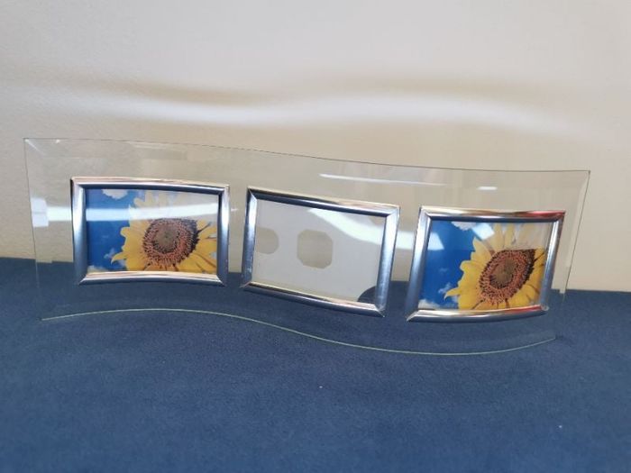 Cadre en verre en forme de vague, bords biseautés. 3 petits cadres entourés d'un bord inox permettent d'exposer des petites photos ou dessins. A l'arrière des emplacements, une partie plastique avec des encoches permet de positionner et maintenir facilement les photos. Dim : 29.5 x 10 cm. Emplacements photos : taille extérieure 8.3 x 6 cm, taille intérieure 7 x 4.8 cm Neuf, jamais utilisé. Les vues de tournesol sont celles de démonstration, il y a encore du film plastique de protection sur les parties inox. #cadre #cadreàposer #cadreavec3vues #cadreenformedevague #cadreàposer #martaydeco #martaymaison