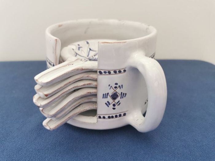 Lot de 6 coupelles céramique artisanale, dans leur support. Forme ronde avec une queue. Elles peuvent servir de cendriers individuels ou petites poubelles de table pour noyaux,...ou autre usage à votre idée. Support : hauteur 6 cm, diam. 9.8 cm Coupelle : diamètre 8 cm, 11 cm avec la queue, hauteur 3 cm. Acheté à un artisan local par mes parents lors d'un de leurs voyages en Afrique du Nord. Signature sous chaque pièce Céramique blanche avec motifs bruns et bleus Peu utilisé, présente les irrégularités liées à la production artisanale, #cendrier #coupelle #cendrierindividuel #céramiqueatisanale #poterieartisanale #afriquedunord #martaydéco #martaytable #martaymaison