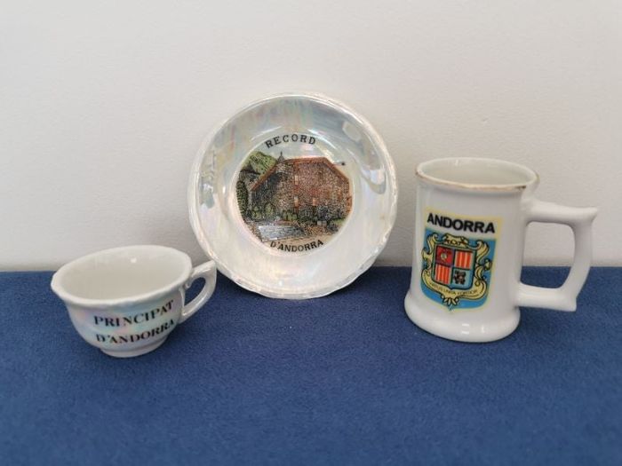 Lot de 3 miniatures Andorre : - 1 tasse à thé porcelaine nacrée, inscription Principat d'Andorra. Diam : 4.5 cm, hauteur 3 cm - 1 assiette porcelaine nacrée, inscription Record d'Andorra + motif peint Diam : 9 cm - 1 chope porcelaine blanche inscription Andorra avec blason, au dos carte de l'Andorre. Diam : 4 cm, hauteur 5.7 cm Très bon état, sauf un éclat sur la chope (cf. photo) #miniaturesporcelaine #porcelainenacrée #souvenirdandorre #collection #miniatures #vaisselleminiature #martaydeco #martaymaison