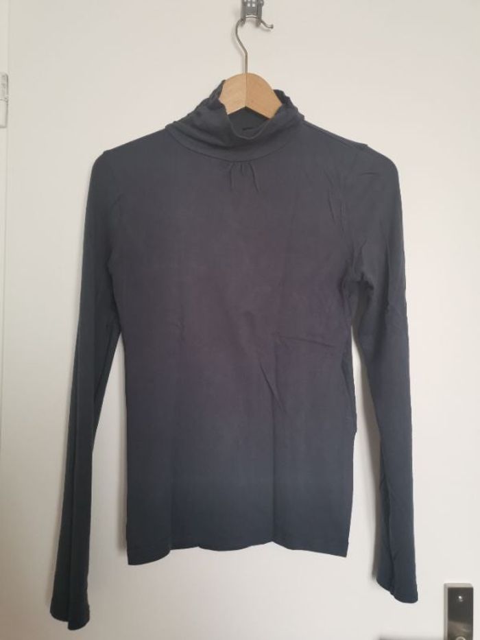 Tee-shirt col montant gris - Jennyfer Petites fronces sur le devant à la base du cou. Piqures sur chaque côté du col le plissant légèrement. Base droite 95% viscose, 5% élasthanne Mesures prises à plat : épaules 35, aisselles 41, base 40 cm longueur devant de la pointe de l'épaule côté cou - base 60.5 cm, longueur milieu dos 58 cm L'étiquette indique taille L, porté par femme 38, les mesures correspondent plus à un 36 porté souple, ou un 38 près du corps. Peu porté reste en globalement en très bon état (quelques bouloches très discrètes devant) #teeshirtmancheslongues #teeshirtcolroulé #teeshirtcolmontant #colcheminée #teeshirtgris #jennyfer #tee-shirttailleM #martayfemme38 #mar-tayado #martayfemme36