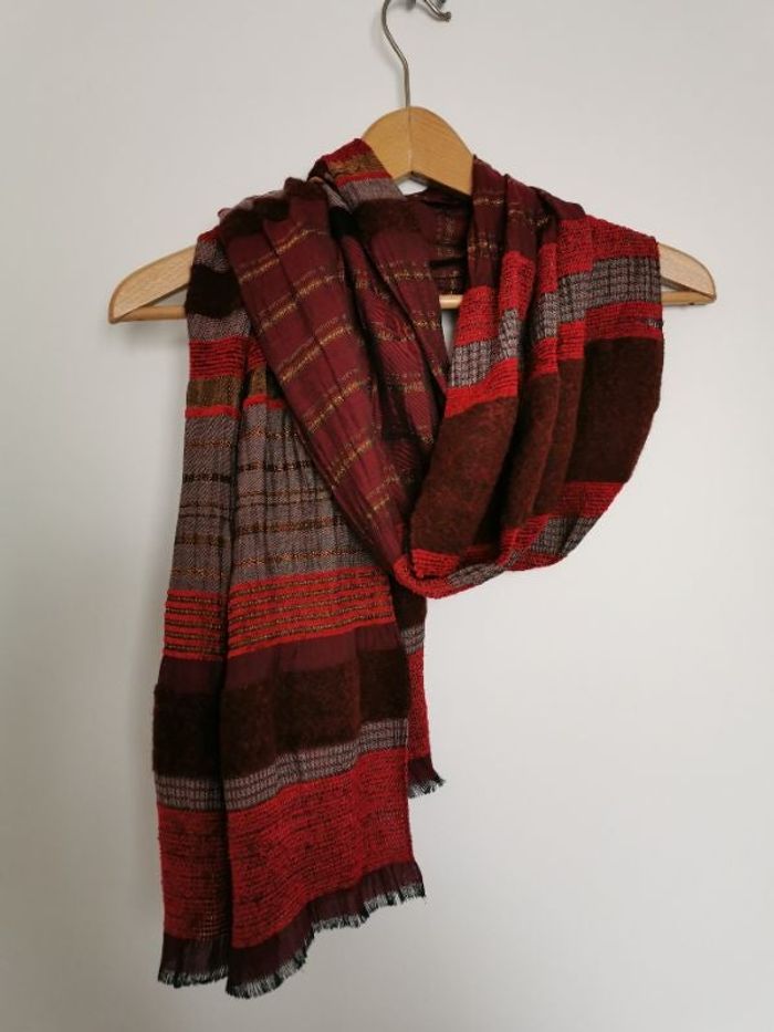 Echarpe composée de différentes bandes de tissus dans des tons de rouge, bordeaux, violet, brun, doré.... Finition brute au bout avec très petites franges noires. largeur environ 45 cm, longueur 190 cm Tissu fin et très doux agréable à porter, à la fois léger et réchauffe bien. Peut se porter style écharpe, ou pour couvrir les épaules en étole. 37% viscose, 35% polyester, 9% laine, 7% acrylique, 7% nylon 5% acétate. Très peu porté, reste en très bon état. #echarpe #etole #etolemulticouleurs #grandfoulard #bordeaux #brun #motifstissés #mixte #couleursdautomne #martayaccessoires