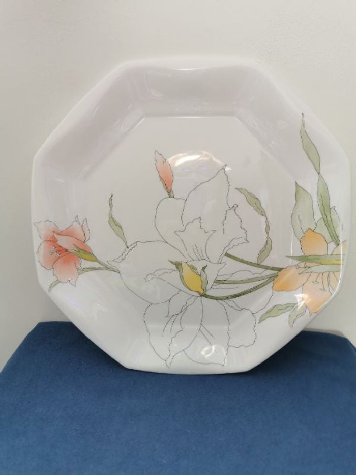 Grande assiette ou plat de service octogonal, fond blanc imprimé fleurs pastels sur un bord. Très solide, aucun éclat ni impact. Résiste au lave vaisselle et compatible micro-onde Peu utilisé, reste en très bon état. Diamètre : 33 cm avec les bords, 25 cm à l'intérieur. Hauteur 1.5 cm (pratique, peu encombrant en hauteur pour rangement ou lave-vaisselle) En vente également dans mon dressing les assiettes à dessert assorties. #grandeassiette #assiettesarcopal #assiettelavevaisselle #assiettemicroonde #assietteoctogonale #assiette33cm #motiffloral #motifpastel #platdeservice #platarcopal #platlavevaisselle #platoctogonal #martaytable #martaydeco #martaymaison