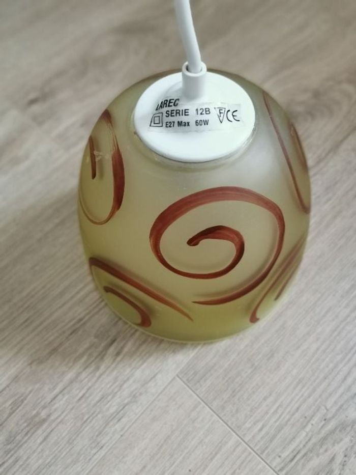 Suspension en verre givré coloré jaune. Déco en forme de spirales peintes de couleur bordeaux. Appareillage de montage et fil blancs Ampoule E27 (gros culot à vis). Puissance max 60 W. Dim de la partie en verre : diam 15.5 cm, hauteur 14 cm Réglage actuel de la partie fil + cache : 40 cm (possibilité de faire plus long, environ 5 cm, ou plus court, à votre convenance). Utilisés, restent en très bon état. Suite à mon déménagement, je n'en ai plus l'utilité. 2 à disposition, 7€ l'unité, 12€ les 2. #suspension #lustre #verregivréjaune #spiralesbordeaux #ensemblede2suspensions #ampoulesE27 #martaydeco #martaymaison