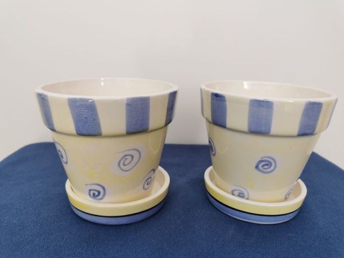 2 pots peints à la main avec soucoupe. Trou d'évacuation de l'eau au fond du pot. Fond jaune clair, motifs spirales et frise blanc et bleu Diam. : 10 cm, hauteur 8 cm Pour petite plante grasse, succulente, herbes aromatiques sur un bord de fenêtre à la cuisine, ... Peut également servie à garder à portée de main, ail et bouquet garni. Jamais utilisés. Neufs avec étiquette. #potspeintsàla main #motifsspirales #potsavecsoucoupes #potscéramique #pothauteur8cm #potdiamètre10cm #martaydeco #martaymaison