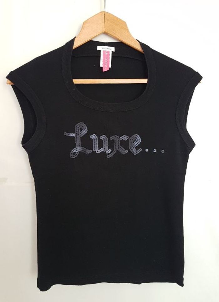 Tee-shirt sans manche. Noir avec inscription Luxe en sequins noirs. Porté, globalement très bon état. Vu de près, tissu un peu "marqué" sous l'inscription. (cf photo) #teeshirtnoir #teeshirtsansmanche #débardeur #paillettesnoires #sequinsnoirs #luxe #softgrey #martayfemme38