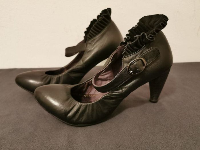 Chaussures à bride à talon 7 cm. Cuir de veau très souple agrémenté d'un petit volant à la cheville. Fermeture par bride et boucle montée sur élastique ; permet de les mettre sans défaire la boucle. Marque Couleur Pourpre. Très peu portées, excellent état, juste une marque sur l'arrière d'un talon (cf photo ). #chaussuresàbride #chaussurescuir #chaussuresàtalon #chaussuresvolantées #toutcuir #talon7cm #interieurviolet #couleurpourpre #martaychaussures35_36_37 #martay