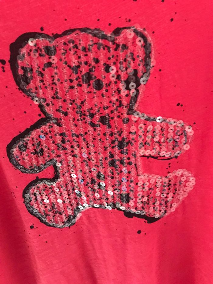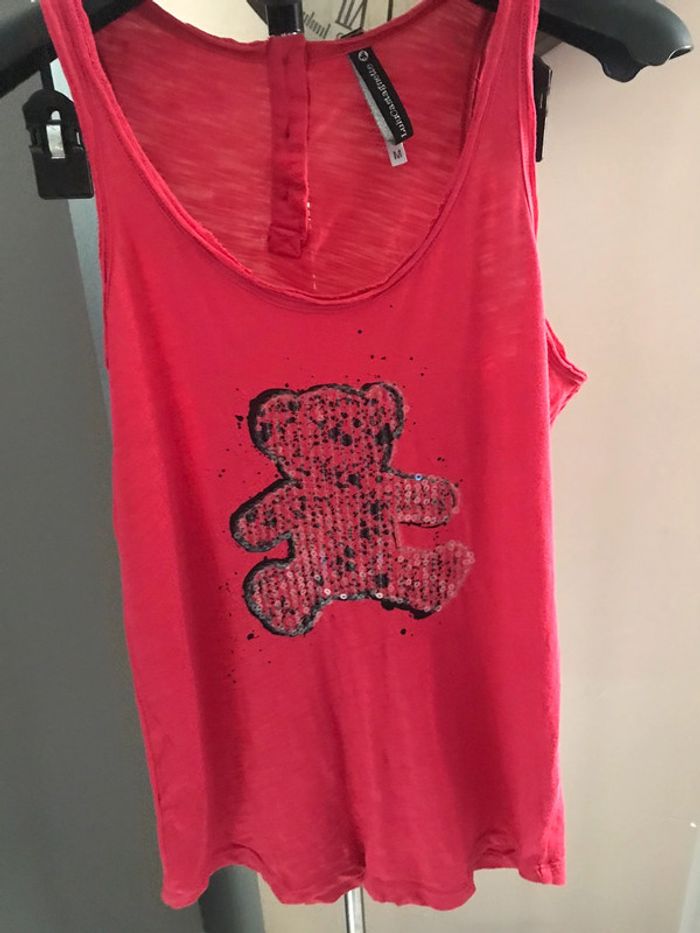 Débardeur rose LuLu Castagnette Devant ours en paillettes 3 boutons au dos Aisselles à aisselles 38 cm Base 40 cm