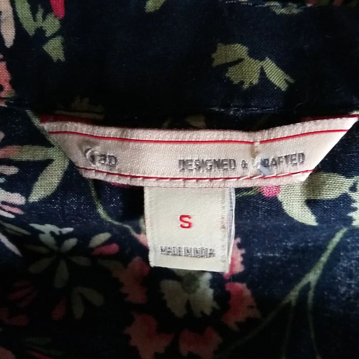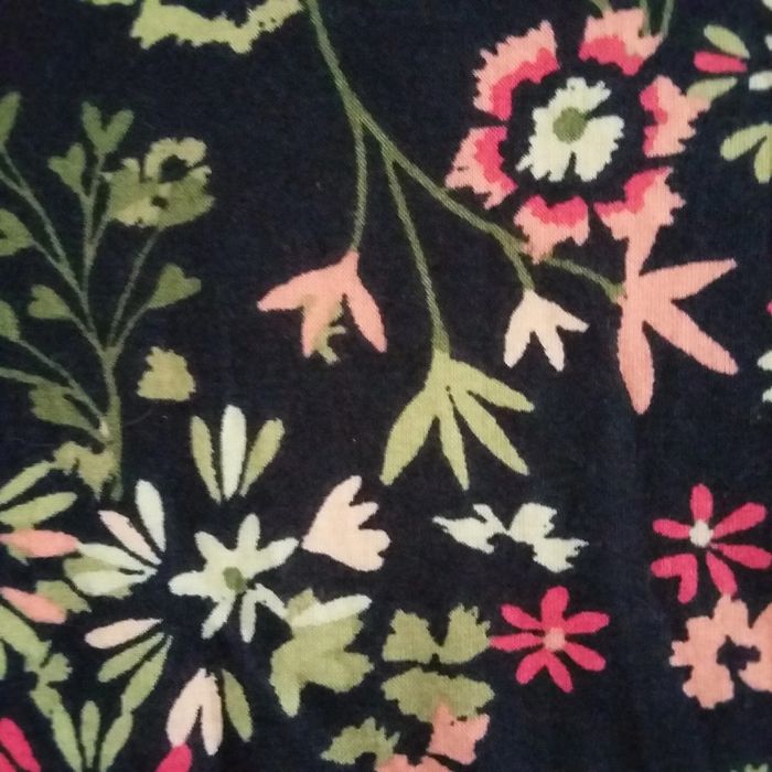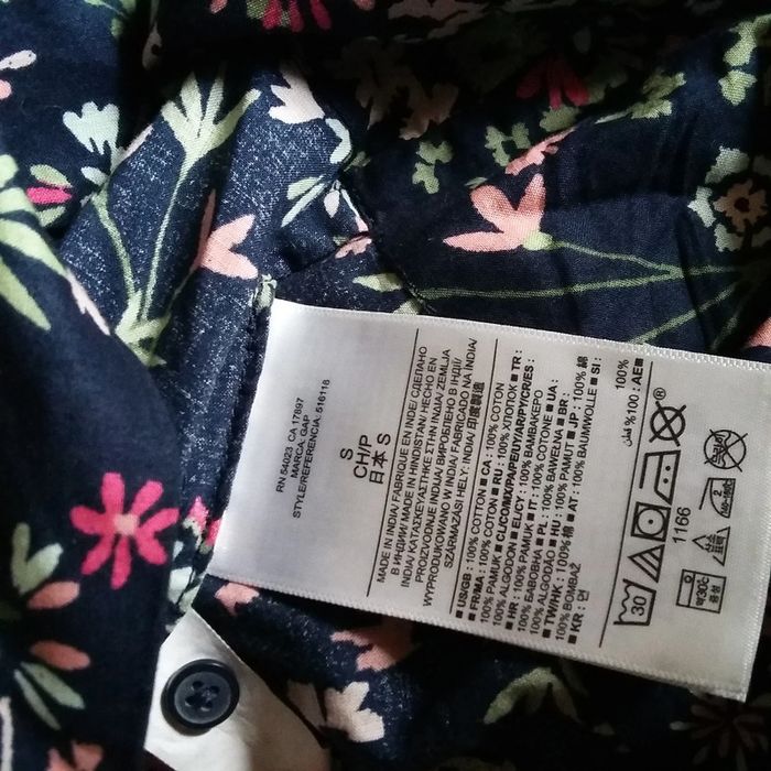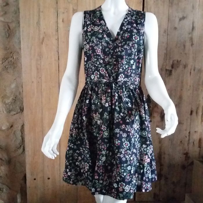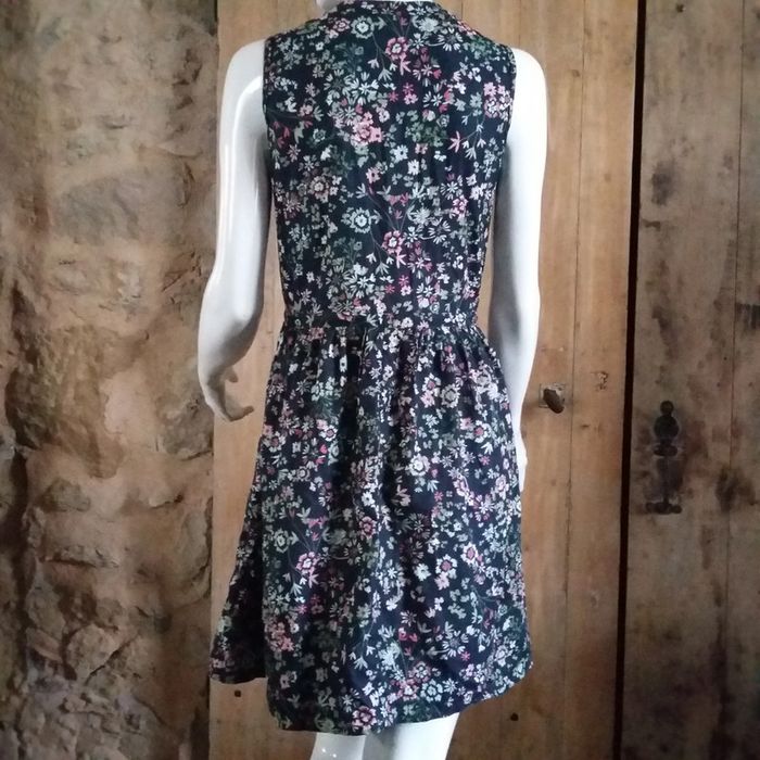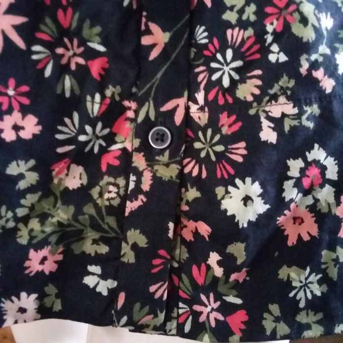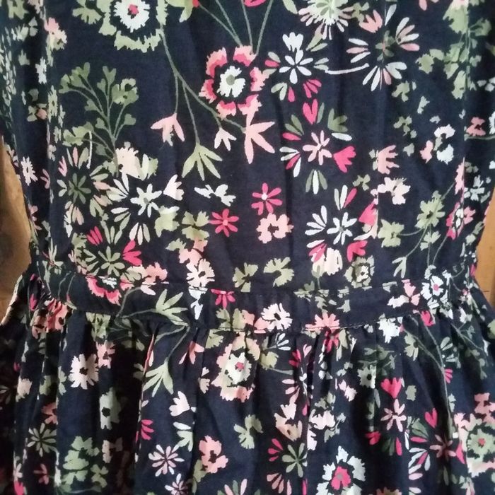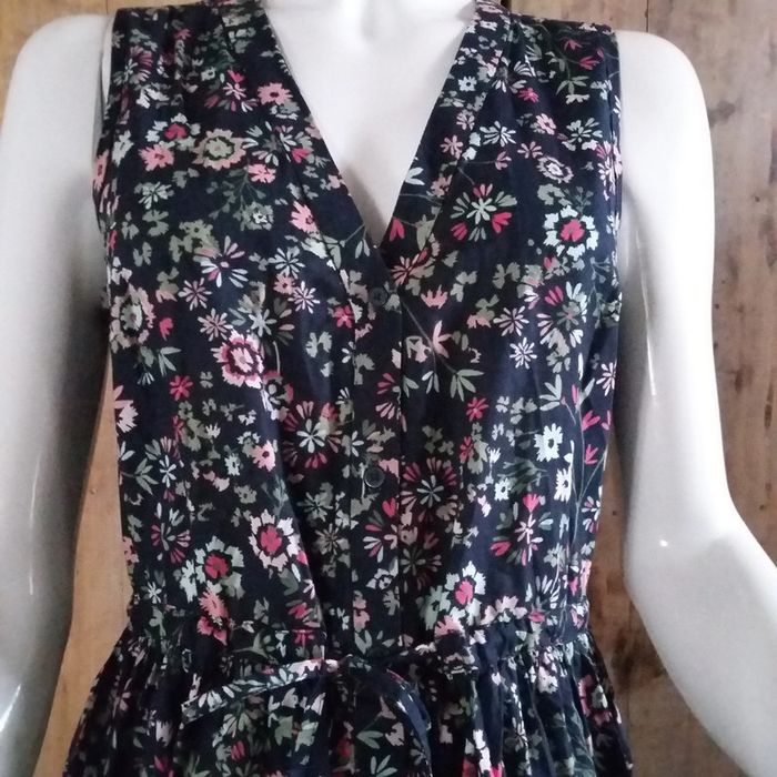 Robe en coton de marque Gap à imprimé floral en rose, saumon et vert sur fond bleu très foncé. Coupe facile à vivre avec le cordon de serrage qui permet de la cintrer comme on le souhaite. Boutonnée tout du long, col en v. Excellent état. #anamelfemmeS pour faire des lot, réductions à la clé !
