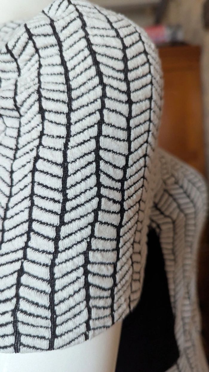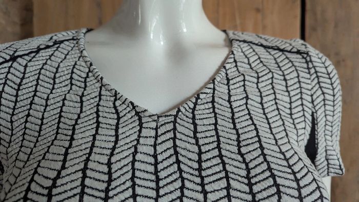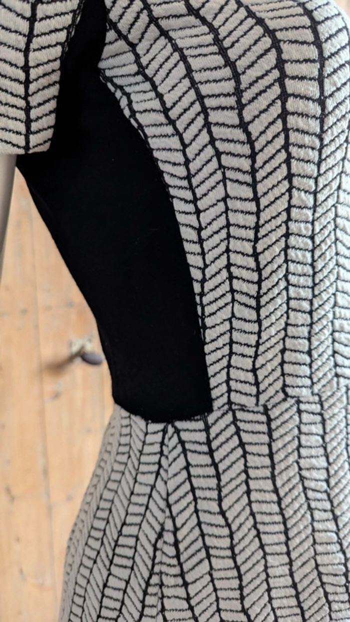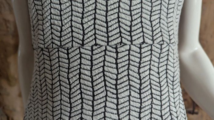 #anamelfemmeXS #anamelfemmeS : lots ➡️ réductions Robe Zara au motifs biseaux en noir et blanc. Matière extensible joliment texturée. Manches courtes, col en V, fermeture éclair à l'arrière. Forme cintrée et évasée, noire unie dans le dos à l'arrière. La taille XS convient aussi très bien à un S. Très bon état. étiquette d'entretien coupée.