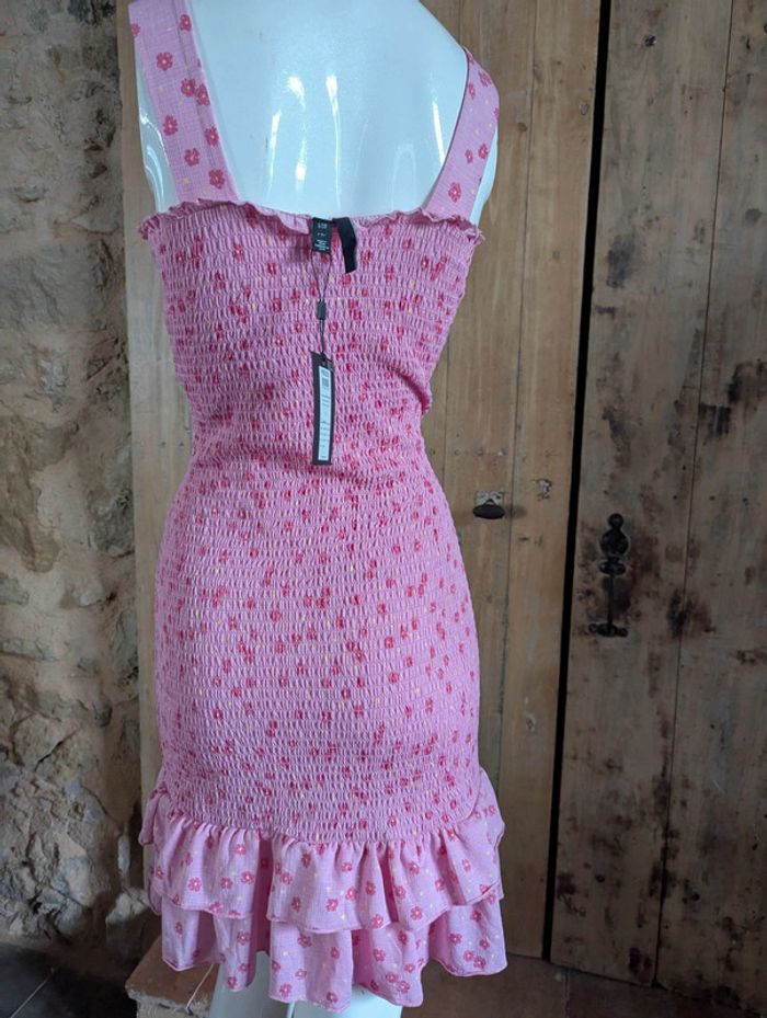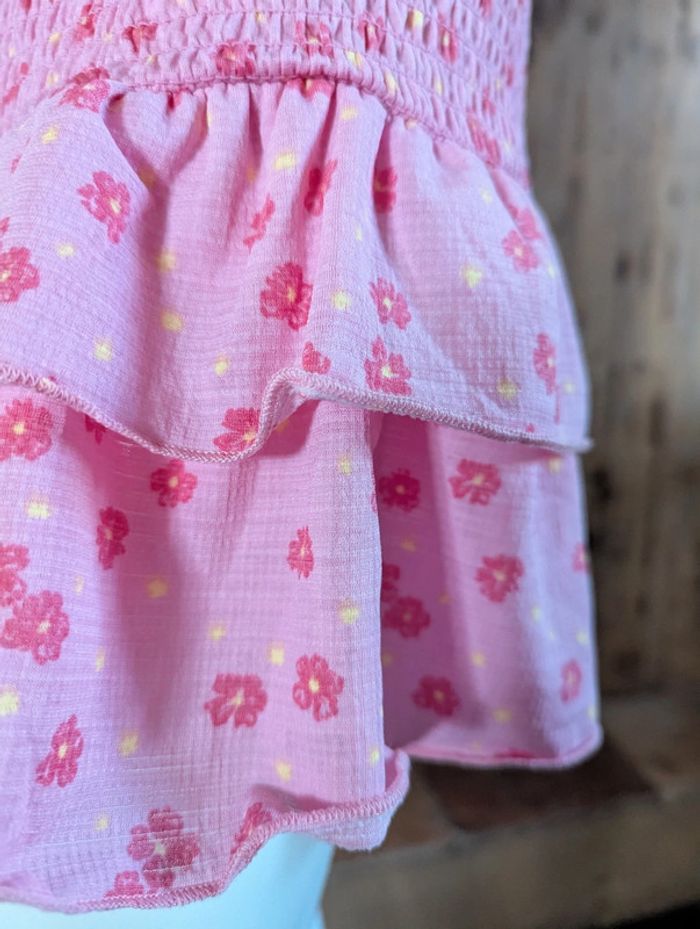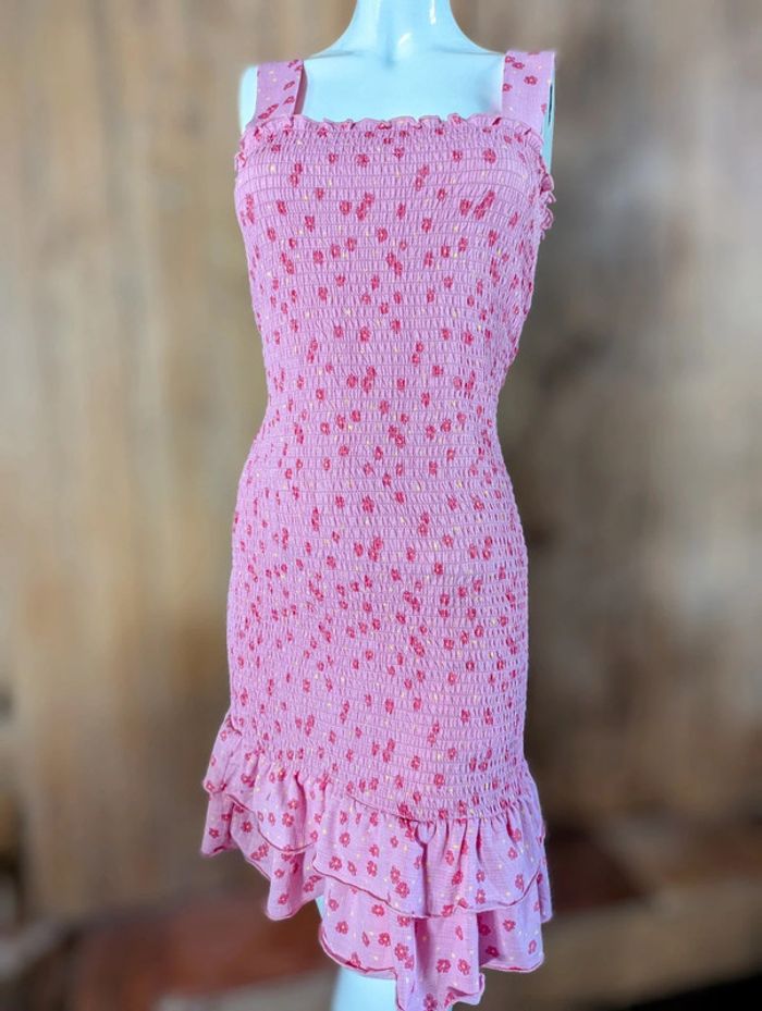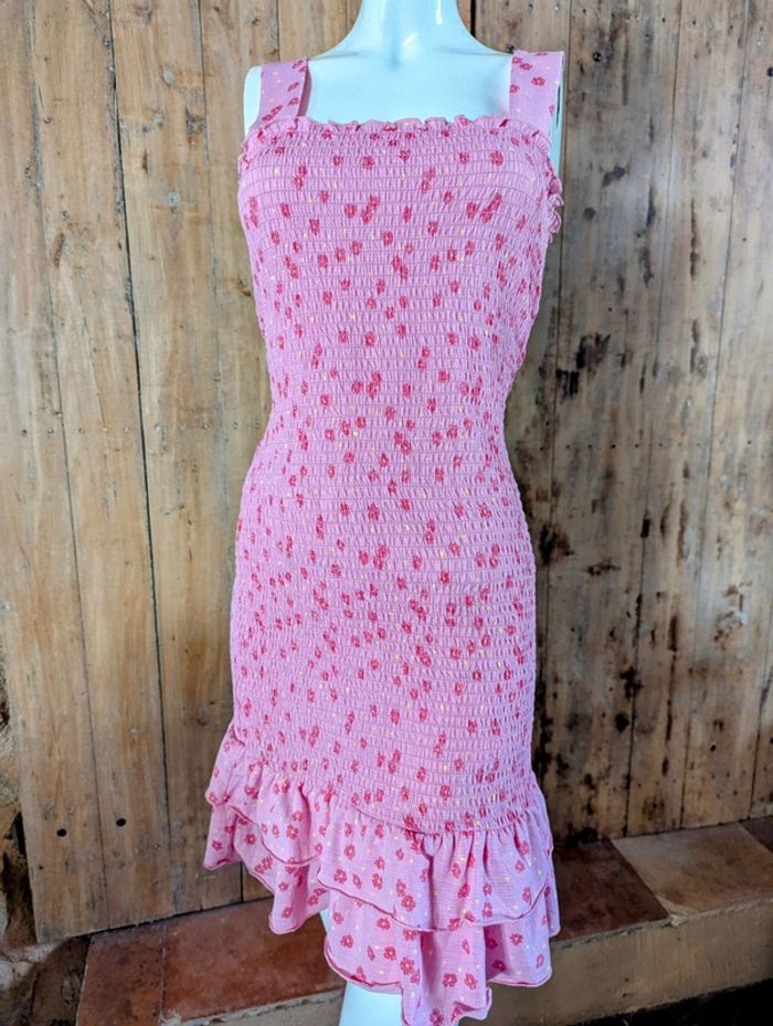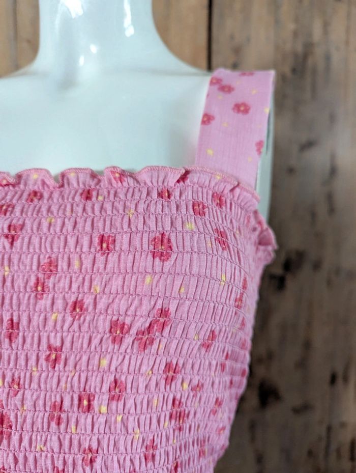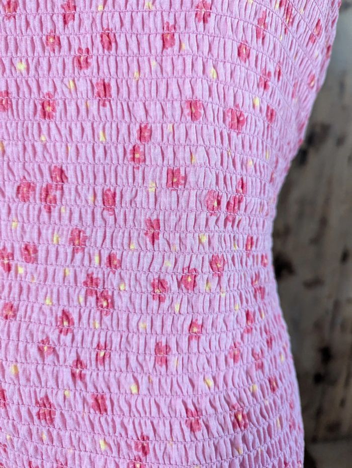 Robe Pieces à fleurs rose foncé + jaune sur fond rose plus clair. Larges bretelles, plissée par smocks, deux volants en bas. Bretelles et volants légèrement gaufrés. Jolie et facile à vivre, s'adapte à toutes les morphologies, idéale pour le printemps-été. Longueur avec bretelles 96 cm, sans bretelles 78 cm. #anamelfemmeL pour faire des lots, réductions à la clé !