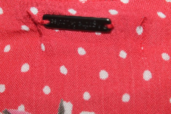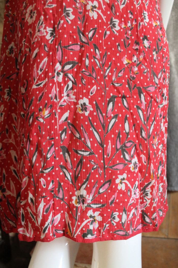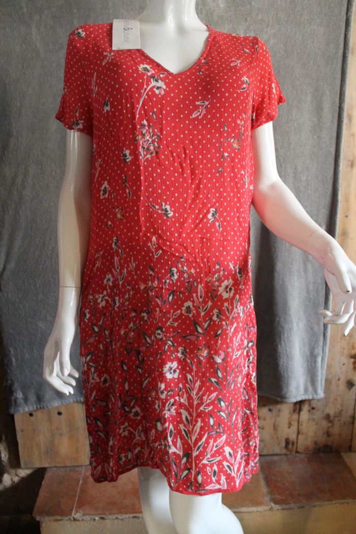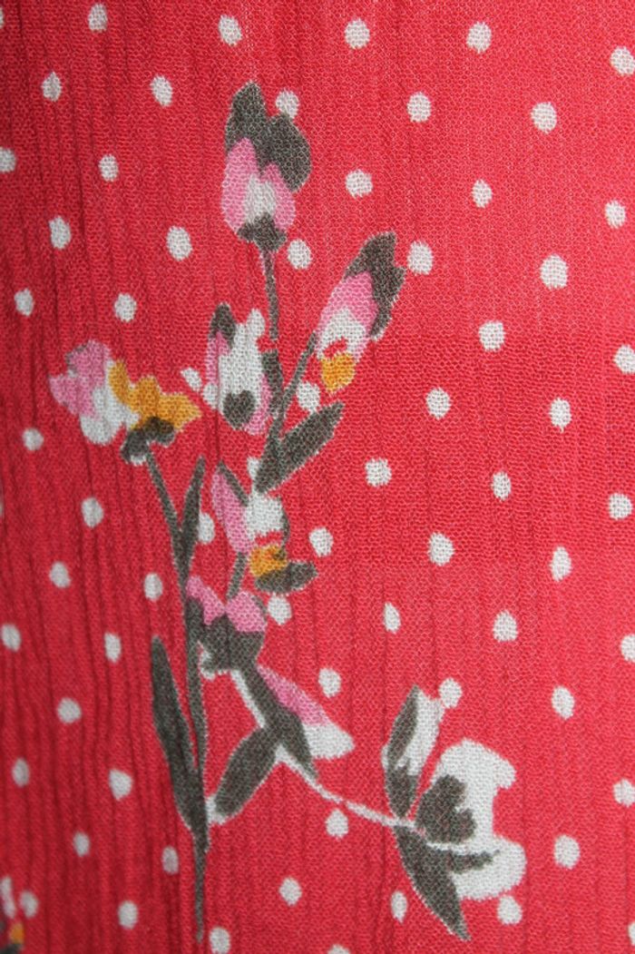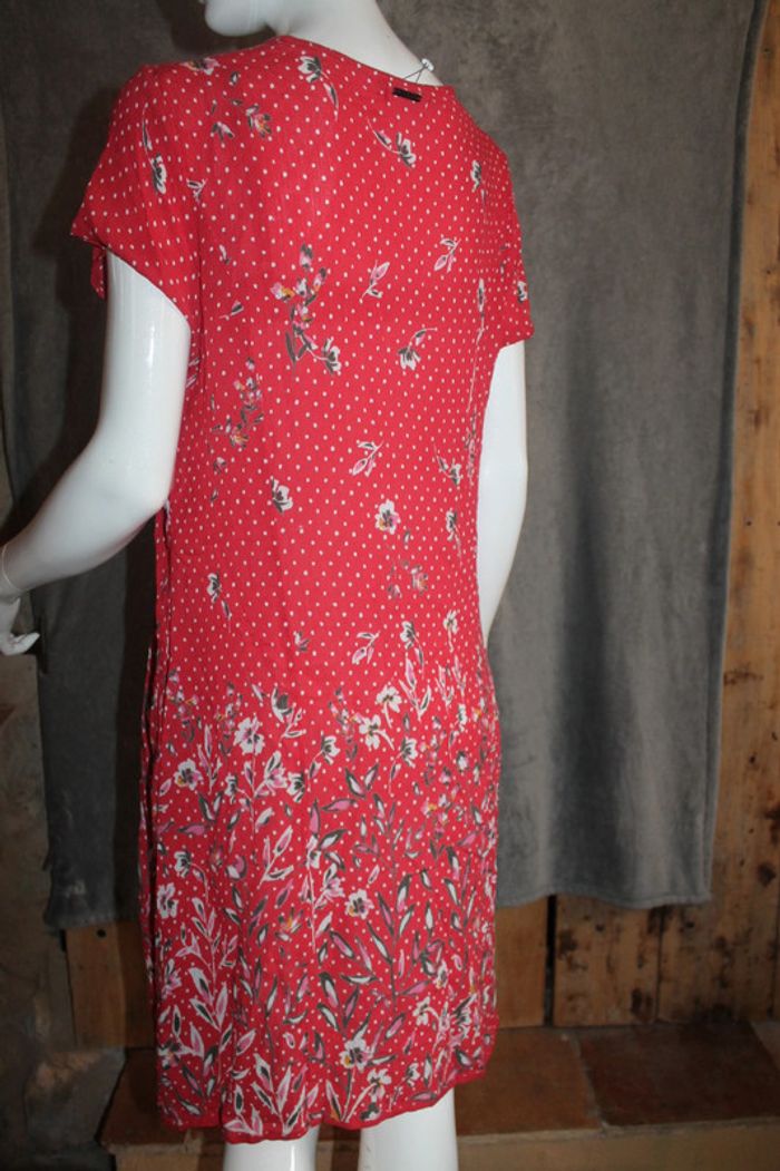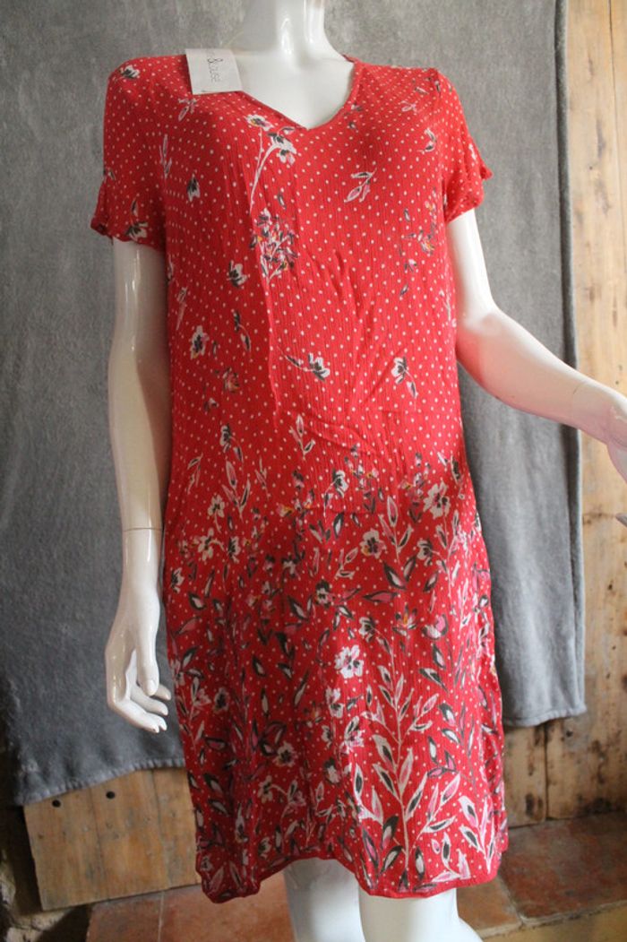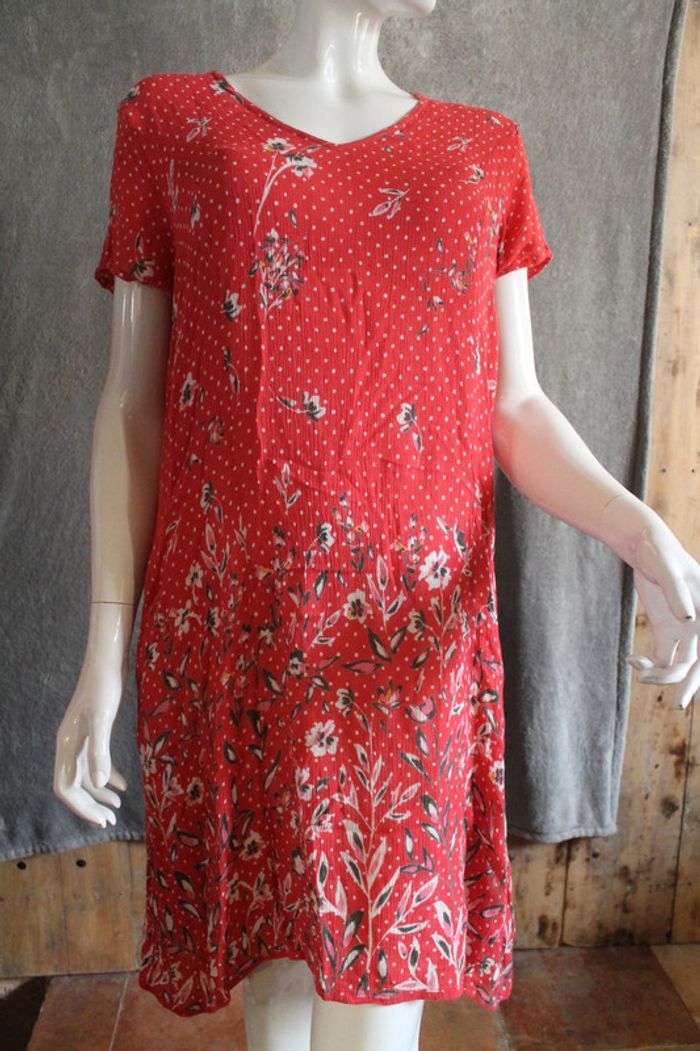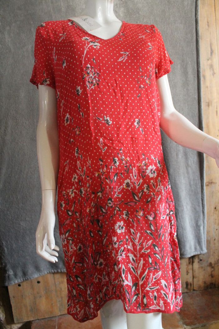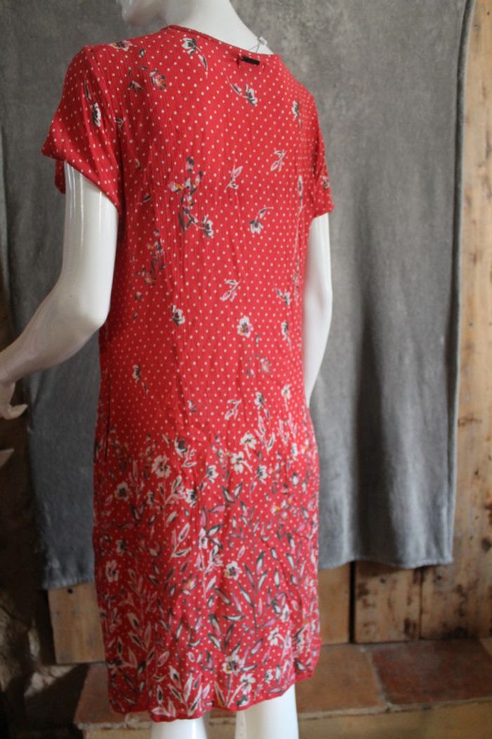 Robe d'été en viscose légèrement plissé à motifs pois et fleurs sur fond corail/rouge clair.