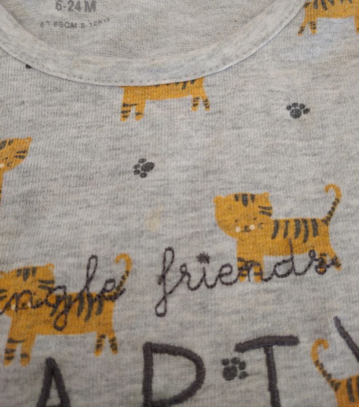 Gigoteuse légère Kiabi pressions au niveau des épaules et fermeture sur le côté Motifs tigre Taille 6-24 mois / 67-86cm / 12kgs Toutes petites taches sur le devant et le col (voir photo) Pressions à l'arrière pour réduire la taille Bon état car souvent mise #articlebebejustine8059