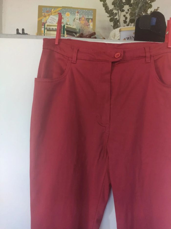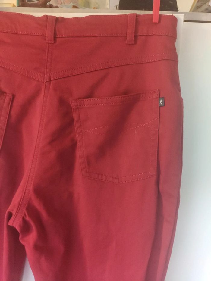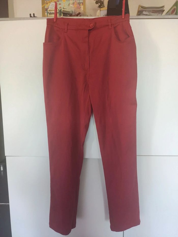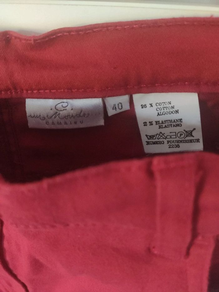 La même forme qu'un jean, un coton avec de l'élasthanne pour s'adapter aux formes du corps, couleur rouge légèrement bordeaux, très bon état, poche au dos, marque camaïeu taille 40. Longueur 94 cm #vulariFemmesL40