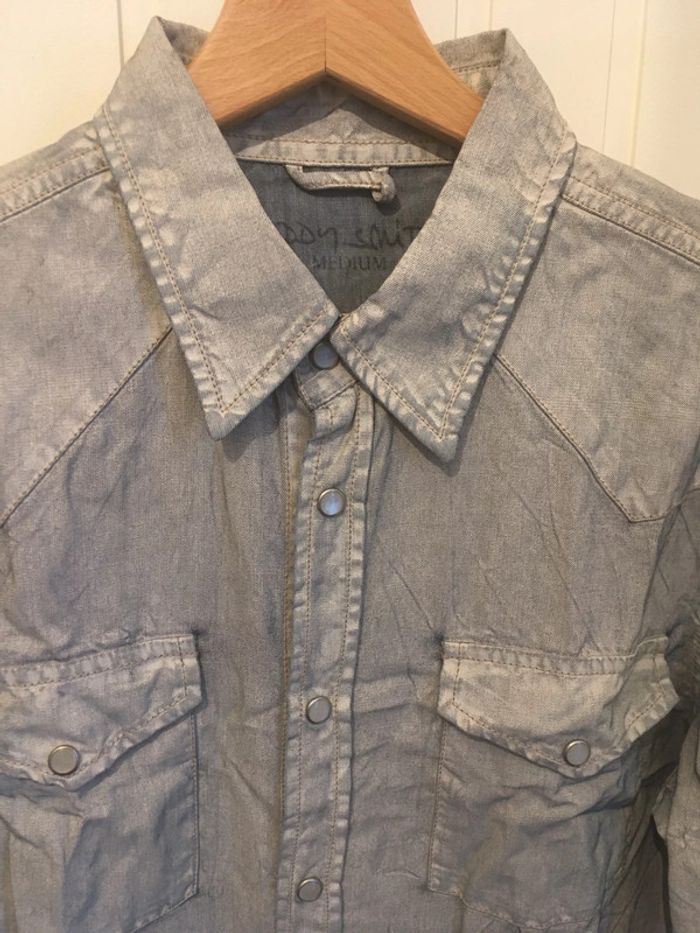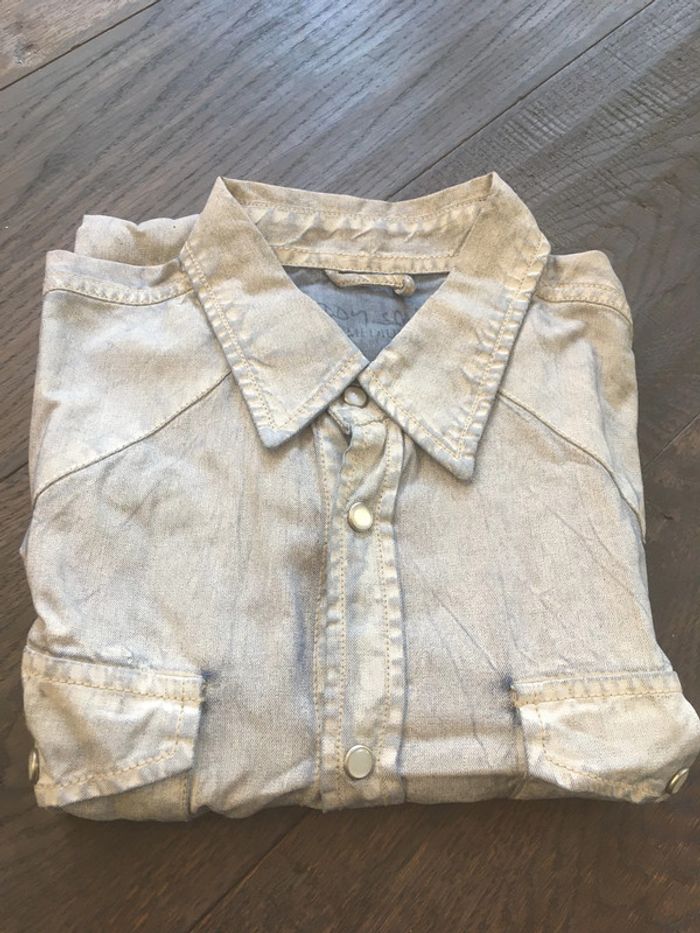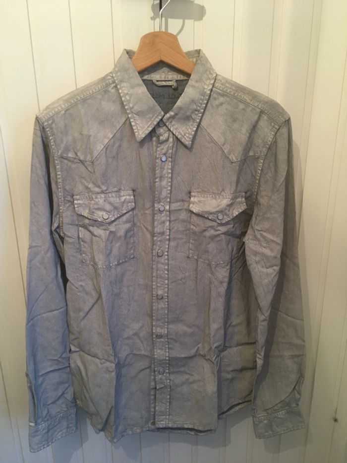 Chemise aspect jean délavée Tissu : 100% lyocell Détail boutons Jamais porté Possibilité de faire un lot avec d’autres chemises