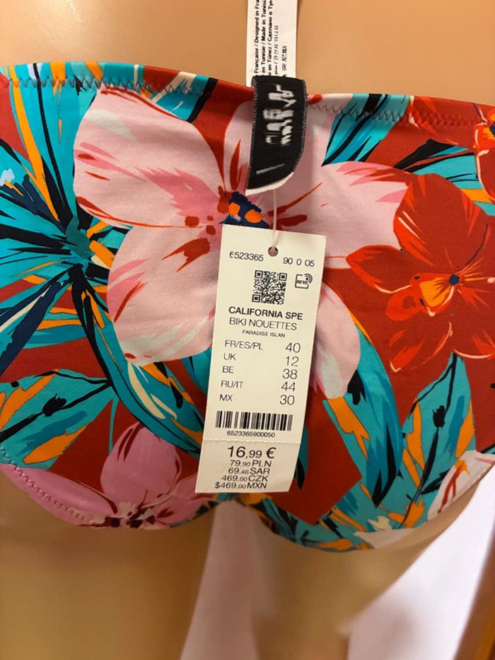 Maillot de bain Bikini 2 pièces Etam Lingerie rouge à fleurs multicolores 🌺 Bas 40 à nouer sur le coté et haut 90C avec bretelles amovibles / bandeau n e u f avec étiquette (valeur 16,99€ et 32,99€) #bikini #etam