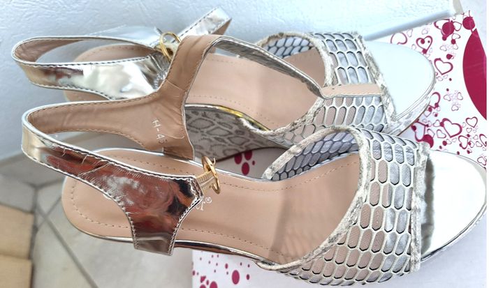 NEUF ! CHAUSSURES TALONS COMPENSES IMPRIME SERPENT ARGENTE- POINT.39 - photo numéro 2