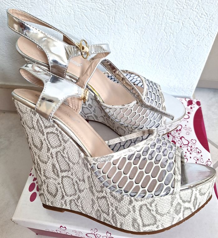 NEUF ! CHAUSSURES TALONS COMPENSES IMPRIME SERPENT ARGENTE- POINT.39 - photo numéro 1