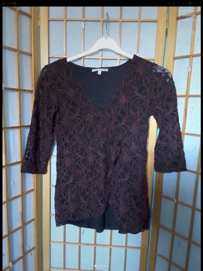 🍓bonjour 🍓 Haut noir avec motifs marron mes manches sont transparentes. J'ai une doublure pour le reste du corps. J'ai une sorte de petit noeud sur le devant. Mes manches sont 3/4 Très peu porté je suis en excellent état. Peut convenir pour un M Une fois chez vous j'y reste