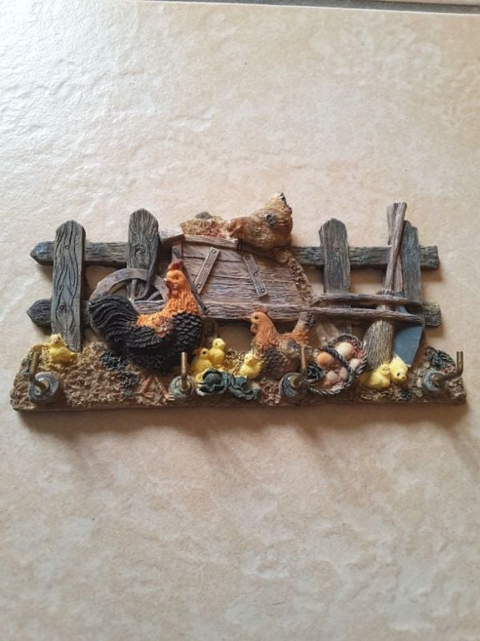 🐔 bonjour 🐔 Support mural sur le thème basse cours, j'ai 4 crochet pour suspendre les clés par exemple. De légère imperfections mais rien qui puisse empêché mon utilisation. Une fois chez vous j'y reste...