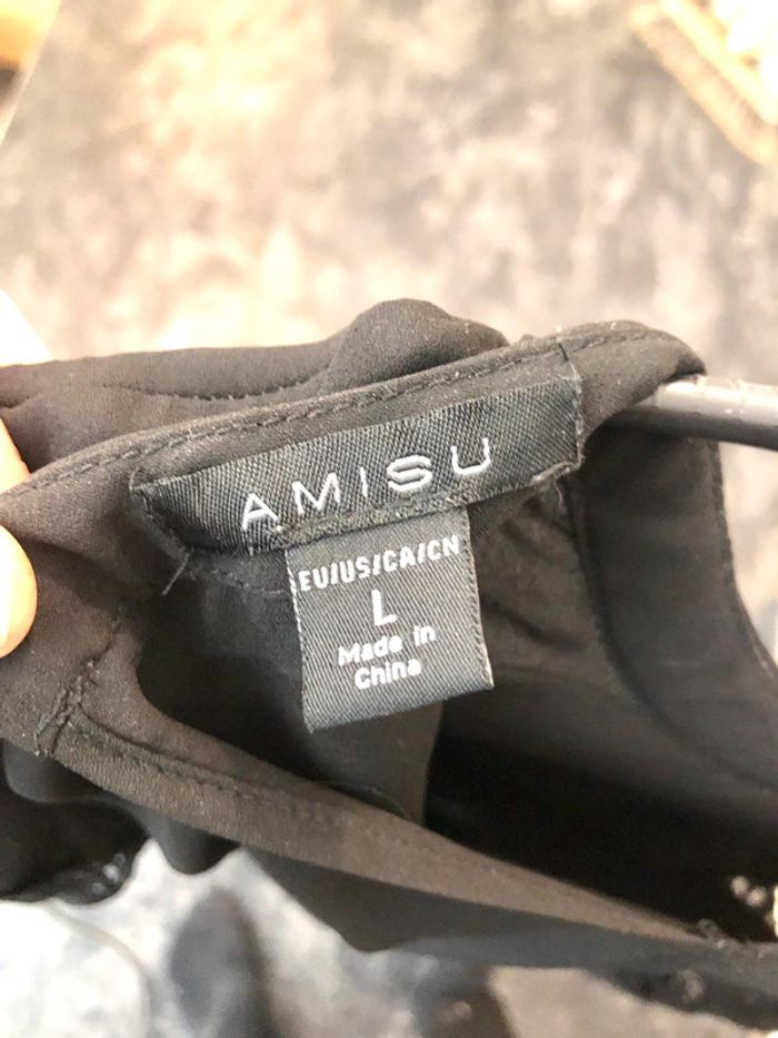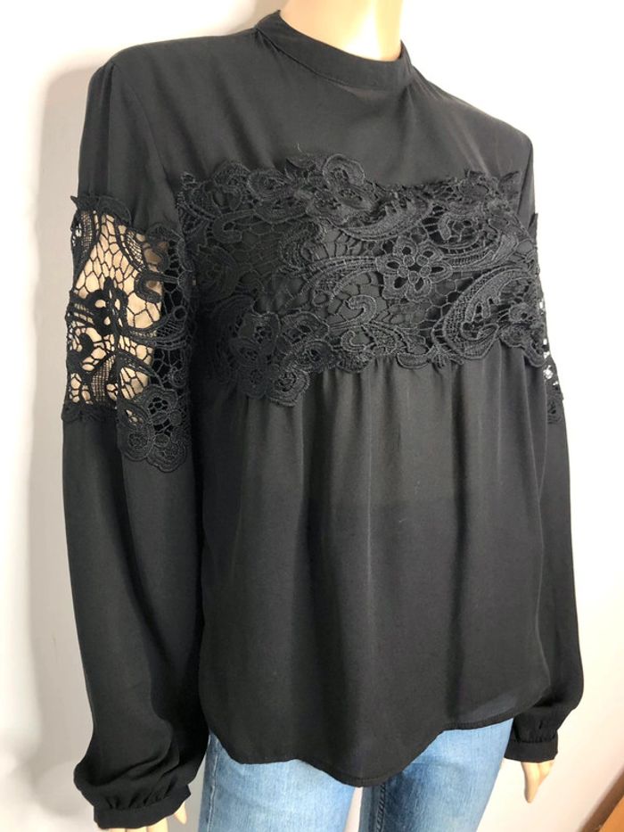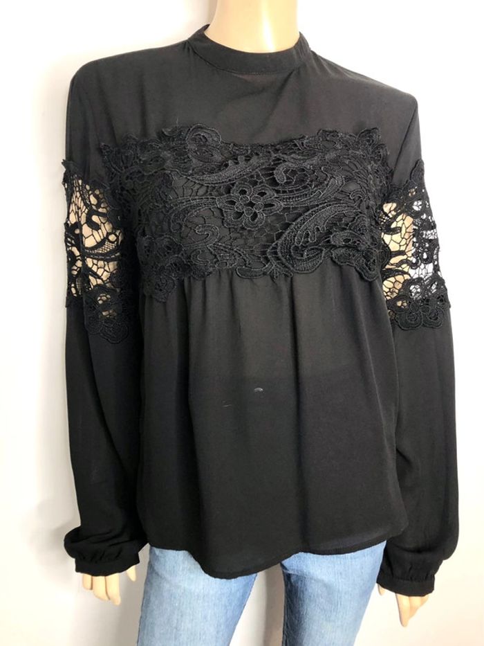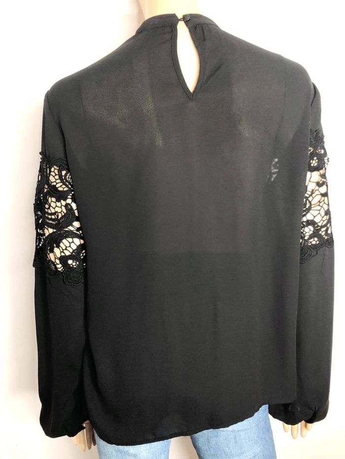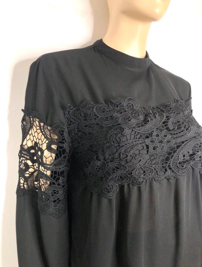 Jolie blouse manches longues, noire, avec empiècement dentelle autour de la poitrine et sur les manches, peut être légèrement transparente par contraste. Marque Amisu Taille L 40 ou inférieur en fonction de l’amplitude souhaitée Voici les mesures : Largeur d’aisselle à aisselle : 56cm Largeur au niveau de la taille : 59cm Longueur totale : 65cm En tres bon état, à peine portée