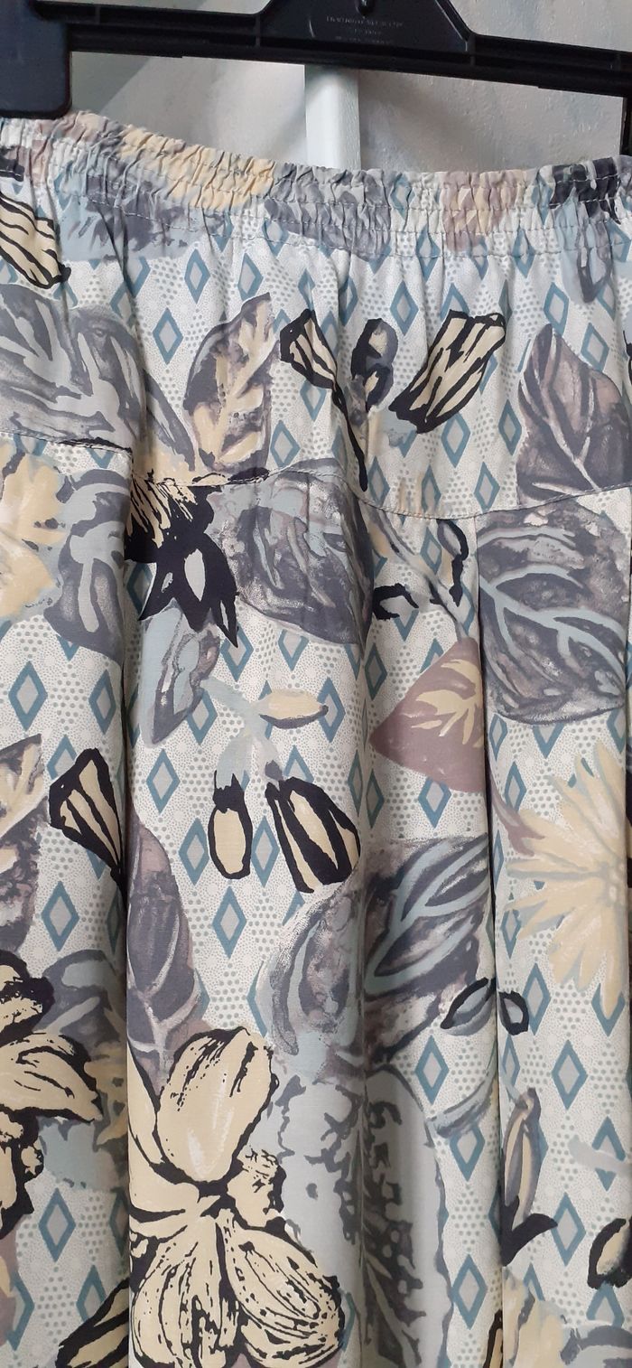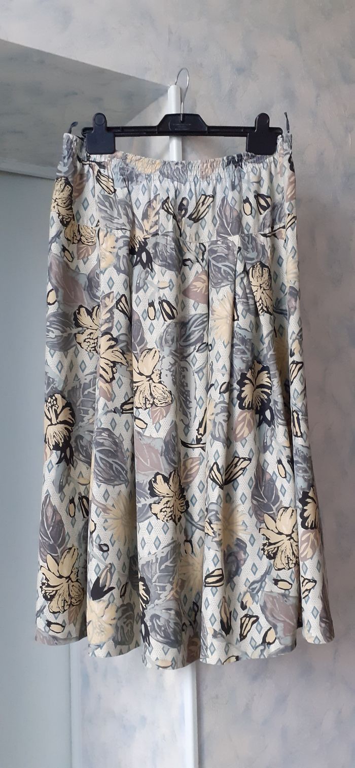Vends une jupe en polyester, tissu non transparent, élastique à la taille, bandeau plat sur le ventre et gros plis ensuite, couleur vert, jaune et gris clair, marque Claude Bauer, taille 44 sur l'étiquette mais peut convenir à une taille 42. Longueur : 78 cm Largeur de la ceinture à plat : 36 à 49 cm.