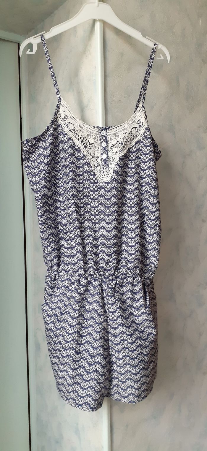Vends un combishort à bretelles fines réglables, en polyester, taille basse élastique, 2 poches latérales, couleur bleu et blanc avec dentelle blanche et petits boutons sur le buste, marque Women Only, taille 40. Longueur sous aisselle : 67 cm. Largeur aisselle à aisselle : 47 cm.