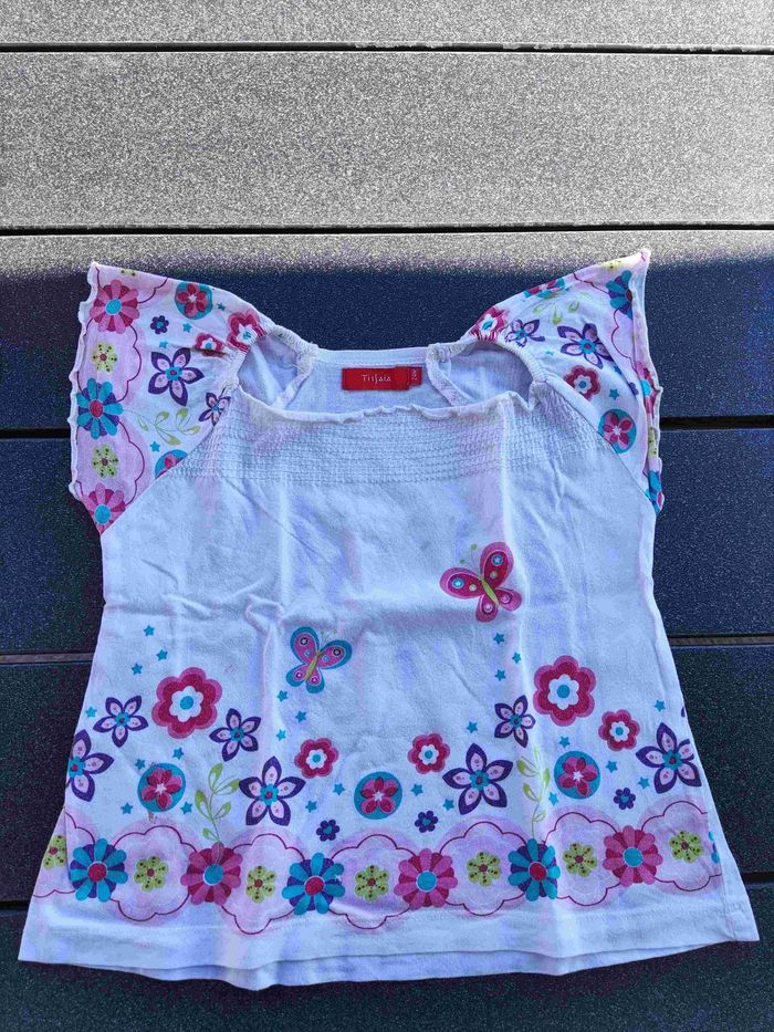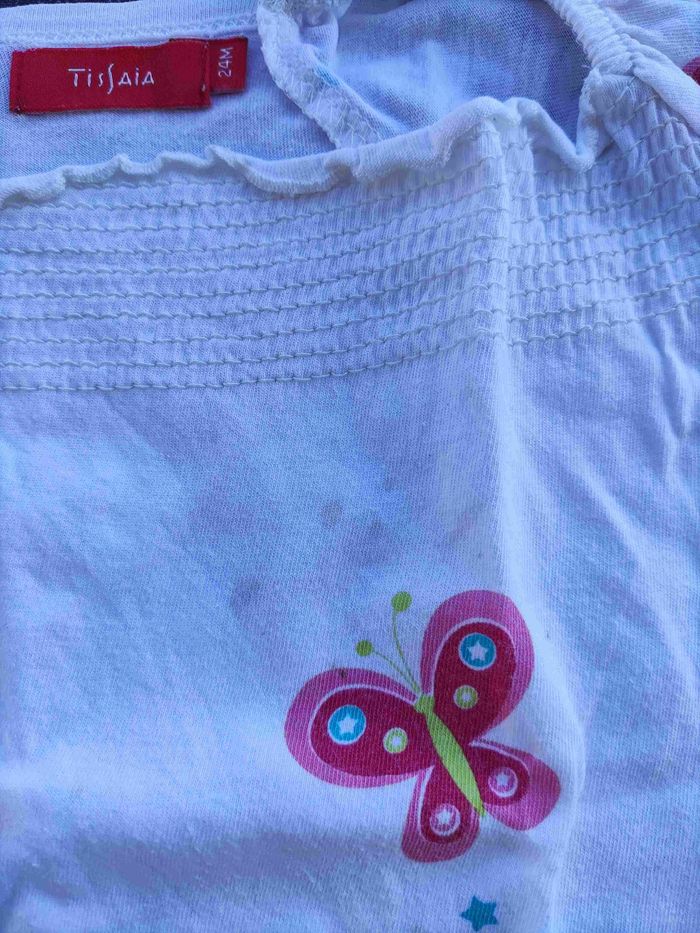 Tee-shirt fille, motifs : papillon et fleurs. Dès petites taches (voir photo) Marque : tissaia 24 mois