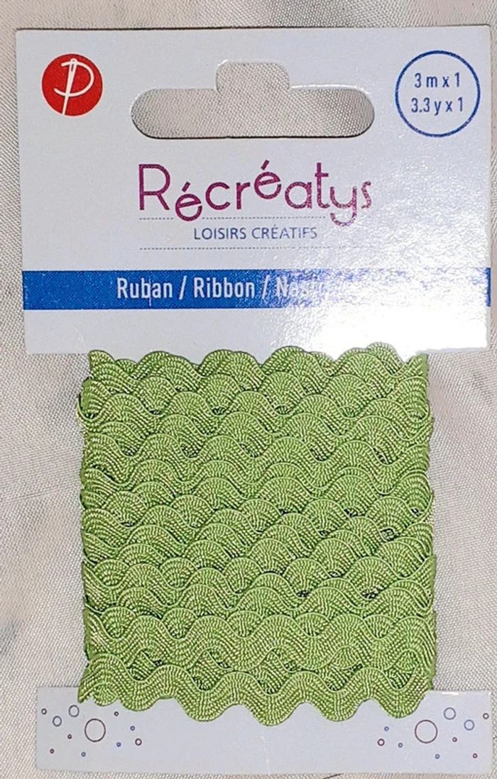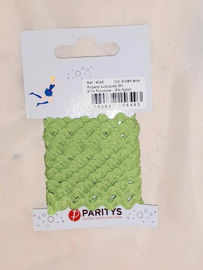 Neuf Ruban vert anis 3mx1 Ruban surpiqué 3m vert anis col 9 ref 4045 91 % polyester 9% nylon Loisirs créatifs #recreatys #paritys #rubanvert #rubansurpiqué #loisirscreatifs #misspouletteperles