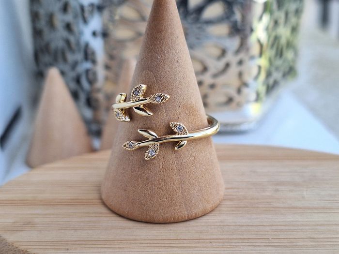 Bague ouverte dorée en forme de feuilles avec strass en acier inoxydable – Bague de fiançailles - photo numéro 1