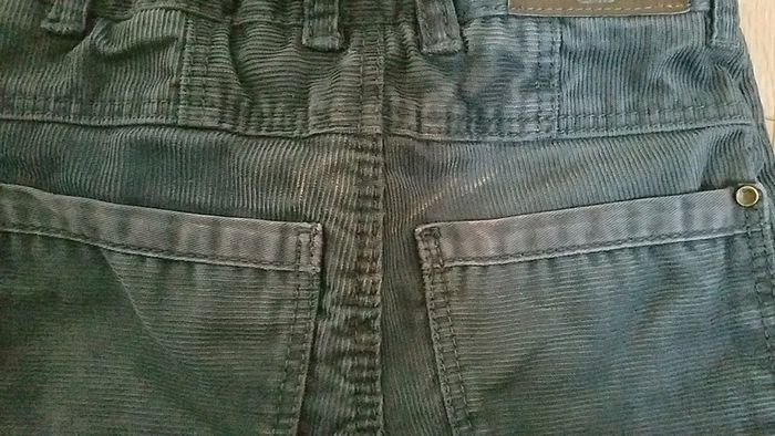 Pantalon velours 5 poches, revers en bas de jambes, élastiques de serrage à la taille. La couleur est gris anthracite tirant légèrement vers le marine. Il y a quelques traces du fer à repasser dans le dos (dernière photo) #2emevie64G3 pour retrouver les produits garçon 3 ans