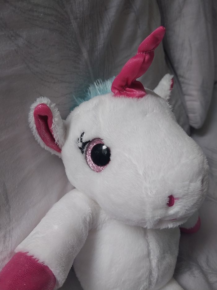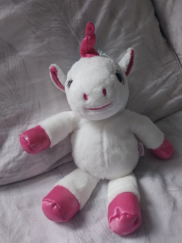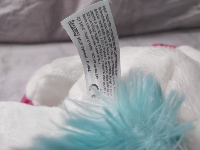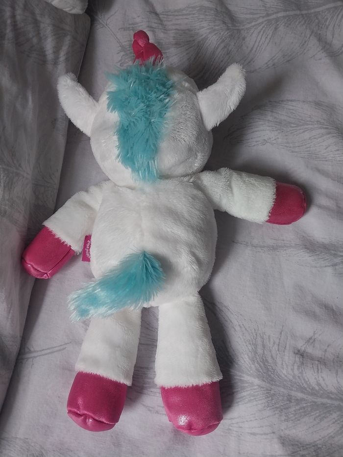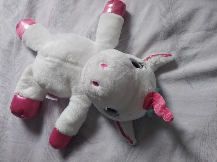 Toute douce et trop mignonne, cette peluche licorne blanche avec sabot rose et crinière bleue fera fondre petits et grands ! Marque Lansay, collection My Baby Tumbling Friends (modèle 2019). 💗 En très bon état, propre et sans tache. 📏 Taille : env. 30 cm 📍 Réf : 55060 🎁 Idéale pour un cadeau ou un doudou de rechange !