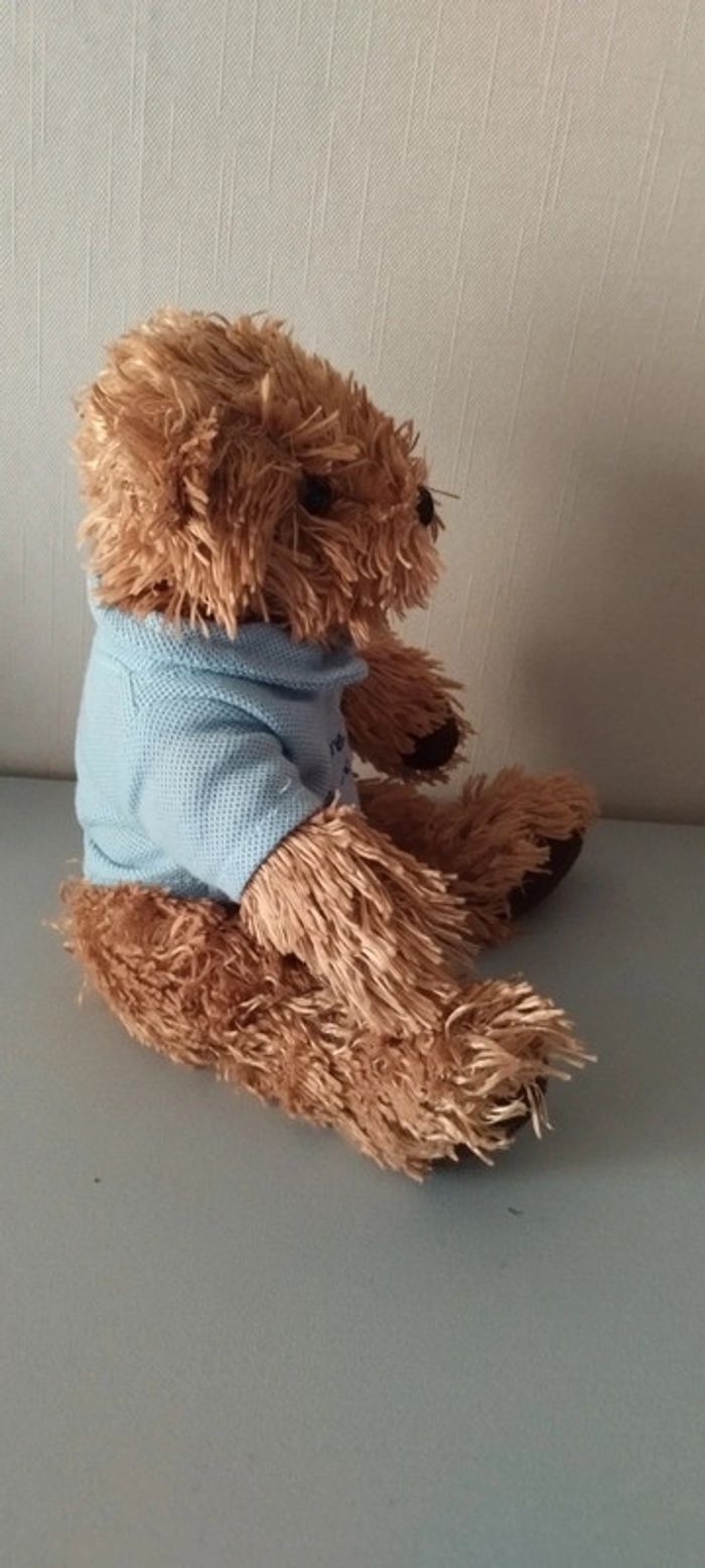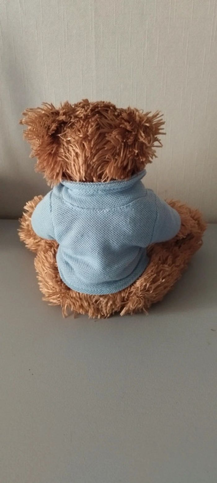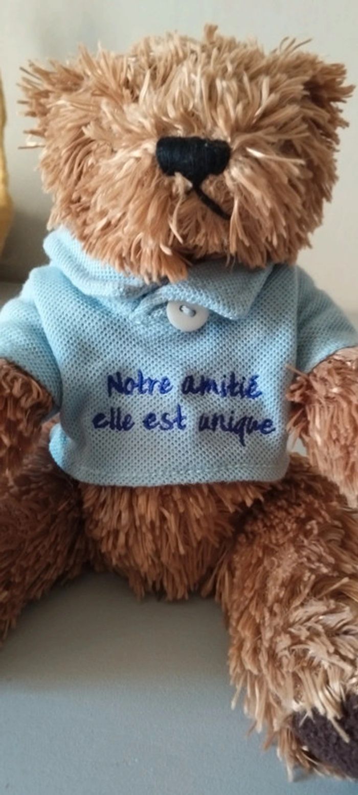 Petit ourson de 23 cm de hauteur Son polo a l'inscription "notre amitié elle est unique" Pattes et fessier rempli de billes. Très bon état. #linejacpeluches