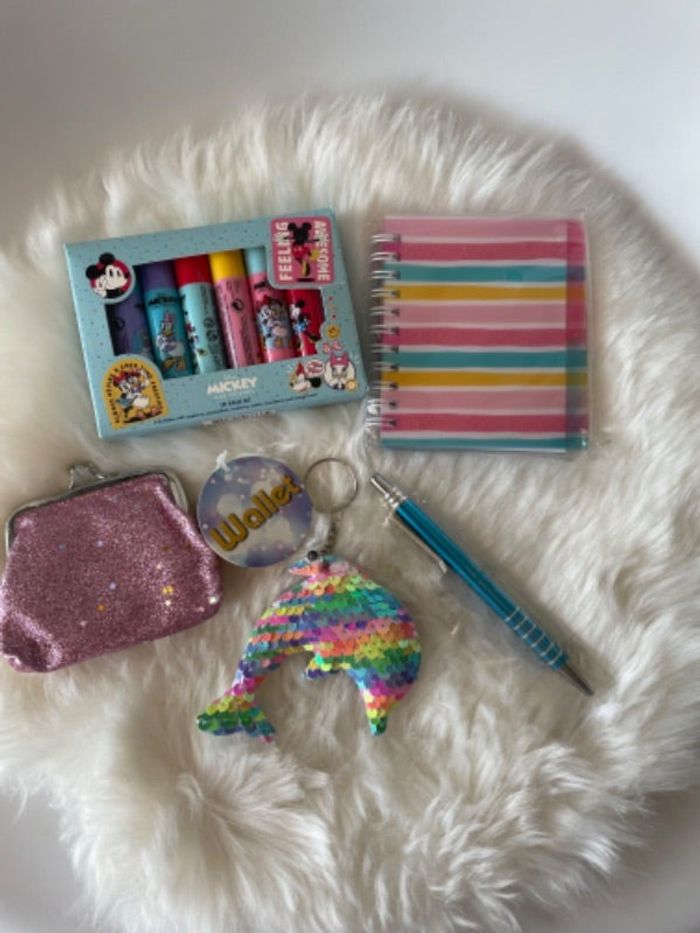 Le lot est composé par: 6x baume à lèvres 1x porte-clés 1x porte-monnaie 1x carnet de notes 1x stylo