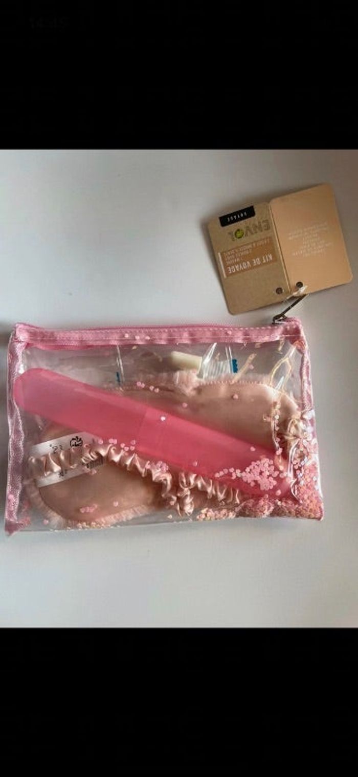 1x trousse 1x flacon pour garder brosse à dents 1x cache yeux pour dormir 1x paire de tampons pour oreilles