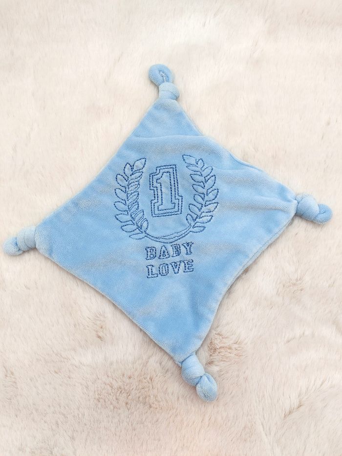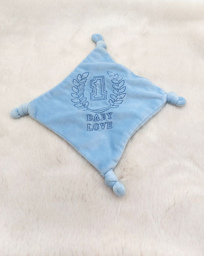 Doudou plat carré bleu Baby Love 4 nouettes numéro 1 couronne laurier Très bon état - l'étiquette est coupée Envoi rapide Réf A12416 #doudou #plush #knuffel #comforter