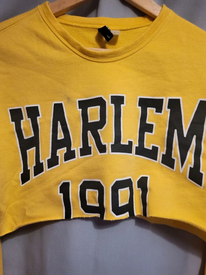 Sweat court jaune harlem 1991 de chez h&m en taille L, juste une tâche entre le A et le R rien de gênant, bon état. #floreteddy_taille40